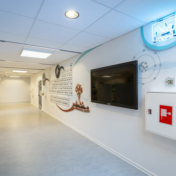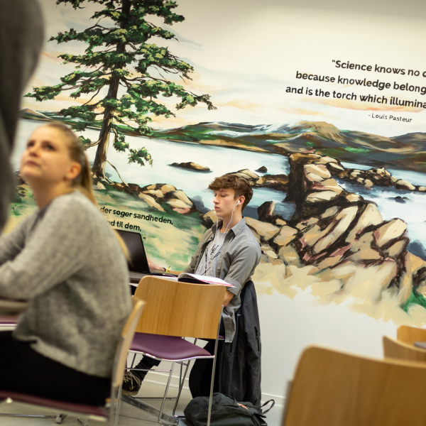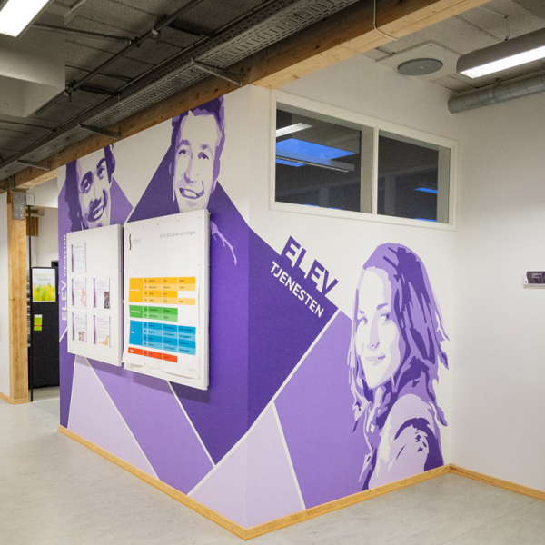 Rødkilde er et moderne gymnasium, der ligger fantastisk flot ved Vejle Fjord. Alt dette skulle formidles gennem 4 vægmalerier forskellige steder på skolen.