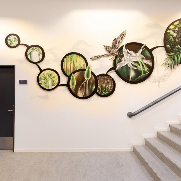 Bæredygtighed og råvarer var udgangspunktet for dette værk. Alle vægge i caféen kom i spil og illustrerede de varierede retter.