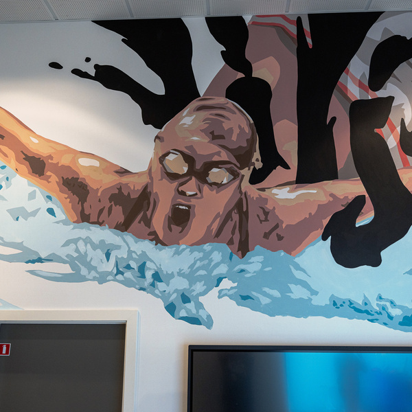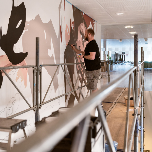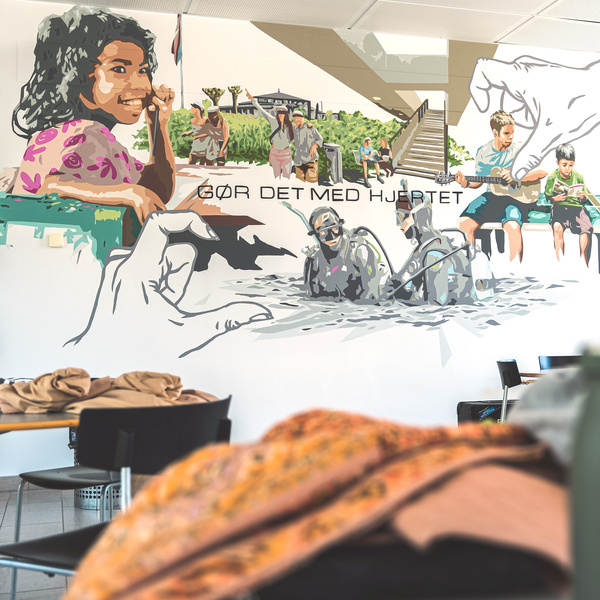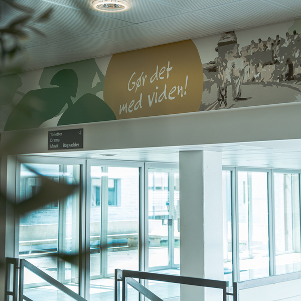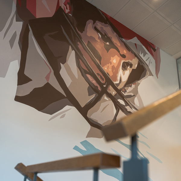 Rødkilde er et moderne gymnasium, der ligger fantastisk flot ved Vejle Fjord. Alt dette skulle formidles gennem 4 vægmalerier forskellige steder på skolen.