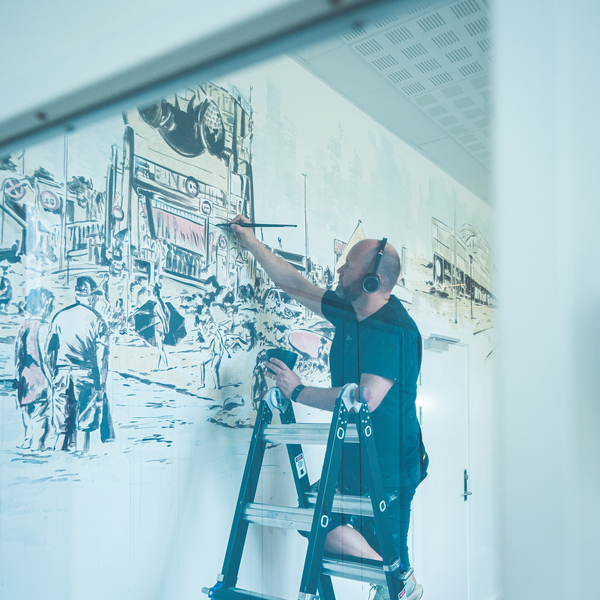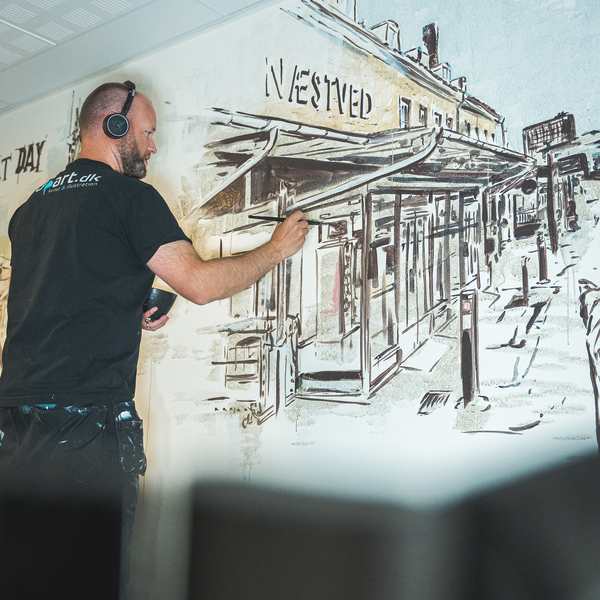Bæredygtighed og råvarer var udgangspunktet for dette værk. Alle vægge i caféen kom i spil og illustrerede de varierede retter.