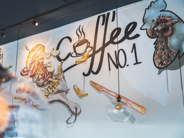 Bæredygtighed og råvarer var udgangspunktet for dette værk. Alle vægge i caféen kom i spil og illustrerede de varierede retter.